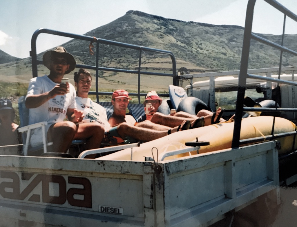 When I got home, this is what I wrote in my diary: “Tragic news. Scatters car went off the road on the way back from Fish. His brother and Hennie die. Scatter and Dorne in hospital”. The service that Friday was beyond words. This was a very sad and dark time for many and for me it’s impossible to drive that stretch of road or go on a trip to the Fish without remembering. I never knew Scatters brother Gavin Slater, a man whose passion was flying, but most paddlers knew Henry (Hennie) Spradbury. He was the founder member of the ‘Hillbillies,’ a bunch of Potch High old boys that included Scatter, Raz (not from Potch) and Donald Morrison, who terrorised the social side of Jo’burg paddling. They used to arrive at the local Croc races in the Winsome Valley straight from a Saturday night party and were generally unplayable. At Dusi in 1991 I found Hennie somewhere on day 2 with a very tired looking old flat bladed paddle. He told me that he had swum and lost his paddle and then thought he was about to be slaughtered when a few locals had arrived with assegais and told him not to move until their comrade returned. He waited as told and a young man returned with an old paddle they had found some years before – with that Hennie’s fear turned to friendship as he was able to finish the day and his second Dusi. I always loved that tale. RIP boys.