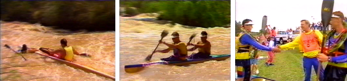 In January of 1994, Dee and I drove down to Dusi with Neil, Hop and Tweet who was seconding them. I had a fun 3 days, finishing in a time of 13 hours 25 minutes. Hop was struck with Dusi guts and they ended up 33rd after day 1, 14th at the end of day 2 and eventually 9th at the end of the race – a great recovery but not what they wanted. John Edmonds and Kevin White, adversaries in the ’93 K1 year, combined well to easily beat Mark Hutson and Les Keay.
