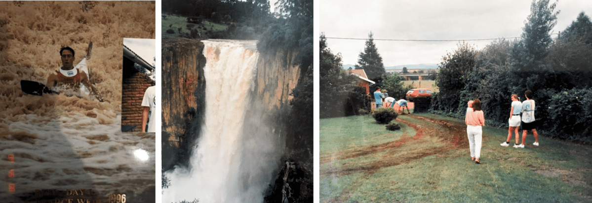 For the 1996 Dusi I drove to Pops’ with Dee and Tim where we joined Neil and Lo, Hop and Tracey, Rod and Jacks, Andrew and Tweet. Day one was a very overcast and wet day, and while rain cools the valley down, it also makes for very difficult portaging if you are a Fish ‘n Chips or back marker because by the time several hundred people have tried to climb a narrow path before you get there it becomes a quagmire and a nightmare. The rains were heavy in Howick too and we all had to go see the falls in flood, plus Pops never did get over how we had ruined his garden with all our ‘bloody cars’.
