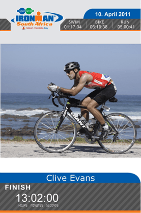 With the half behind me I decided I needed to attempt the real thing, the full Iron Man and off I went to Port Elizabeth where I stayed with my cousin, Russel and Kim Tucker. I had however buckled and bought a fancy new carbon frame bike; new for me but not new, the back stays had been broken but having fibreglassed lots of damaged boats in my paddling years I knew it could be easily repaired and bought it for a steal. I finished my first full Iron Man in just over 13hours; it was more like a challenge overcome than anything else. Although I really did enjoy my day in PE and particularly the swim, I have to say that the ride was disappointing because although I don’t mind my own company it was strange to be out there for 6hours and not be able to talk to anyone (because of their no-drafting rules), so it totally lacked the camaraderie aspect ultra’s. Then, after 4km’s in the water and 180km’s on a bike, the 42km run is tough, but at least then there are lots of people to talk to, and the best part of the run is the local support as half the city come out to watch ‘their race.’ It was a long day, but I did feel fantastic on the red-carpet hearing “Clive Evans, you are an Iron Man.”
